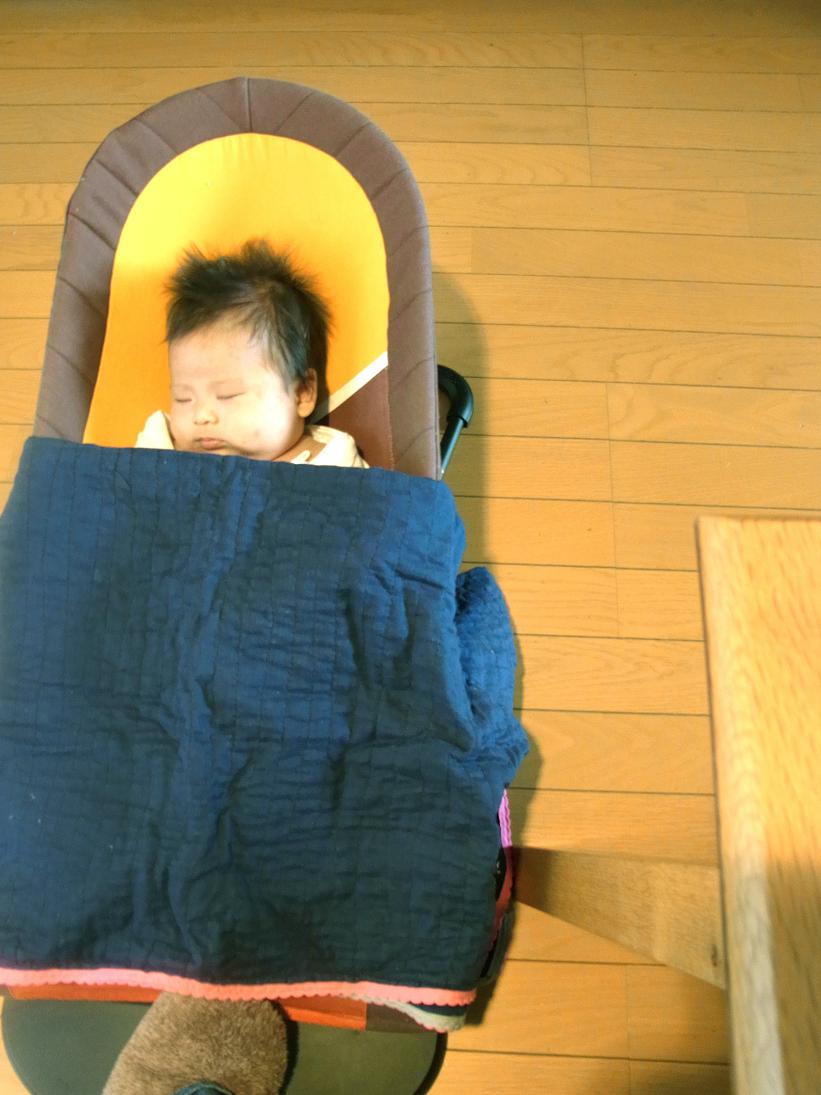 子2を片足でバウンサーを揺らしもって。あみあみ。